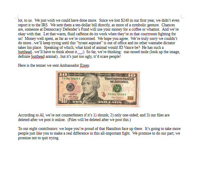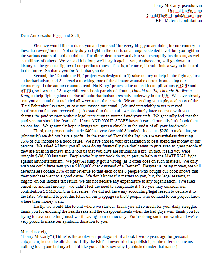 To the eight people who have contributed to our cause, we thank you very much! Our total revenue at tax time was $40. It cost us $280 to make that (so we lost $240 last year). In the spirit of ‘Donald the Pig’ we have sent ‘Democracy Defender’s Fund’ $10 (which is 25% of total revenue) so that EACH ONE OF YOU knows that you contributed to help our democracy. We only wish we could have sent them a lot more, to be honest.